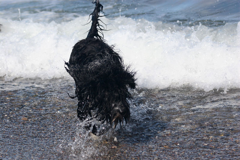 Ganz offensichtlich befindet sich in Gretls Ahnentafel irgendwo ein Seehund! Von ihrer Mutter hat sie das nicht. Und es wurde mir glaubhaft versichert, dass Gretls Wasserfreude nicht davon abhängig ist, dass sie einen großen schwarzen Freund dabei hat! |